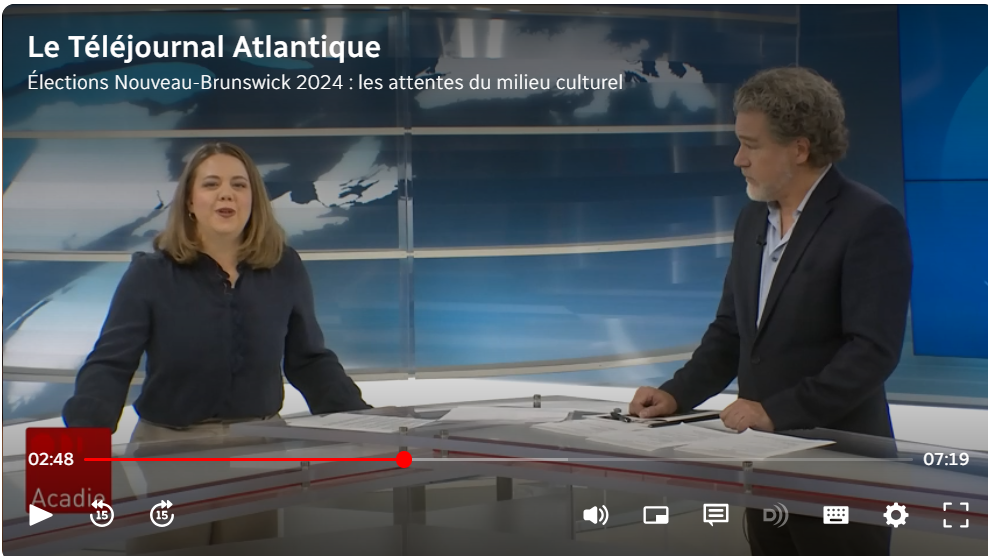 Jean-Philippe Raîche, président de l'Association acadienne des artistes professionnel.le.s du Nouveau-Brunswick, présente et explique les revendications de l'AAAPNB à Margaud Castadère, dans Le Téléjournal Atlantique du 06 octobre 2024.